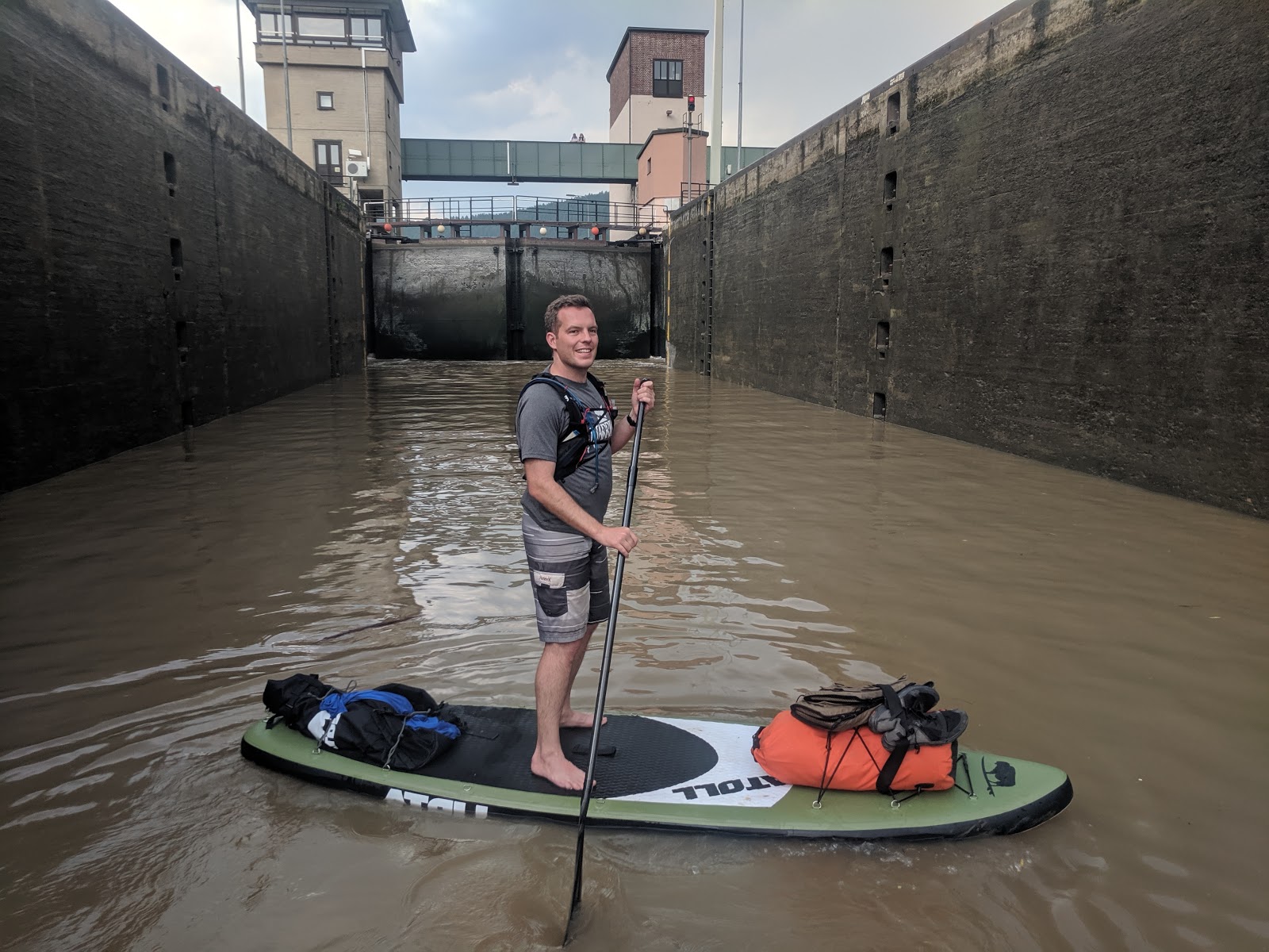 Hitting the Locks. Unfortunately, most Germans (especially lock operators) feel paddel boarding in the Lock is too dangerous with the risk of Shawn falling off his board and everything. So we had to carry our stuff around the lock...